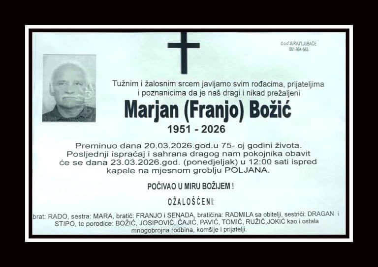 Posljednji ispraćaj i sahrana pokojnika bavit će se u ponedjeljak, 23. marta 2026. godine, u 12:00 sati, na mjesnom groblju Poljana. Laka mu bh. zemlja