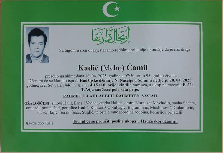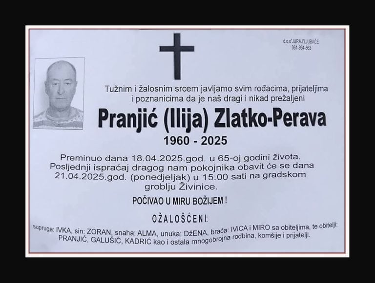 Ispraćaj će se obaviti u subotu, 13. decembra 2025. godine, u 14:00 sati, na mjesnom groblju Par Selo. Laka mu bh. zemlja