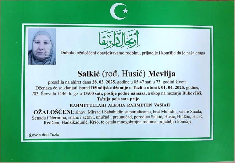 Dženaza će se klanjati ispred Džindijske džamije u Tuzli, u utorak, 1. aprila 2025. godine, a ukop je na mezrju Bukovčići
