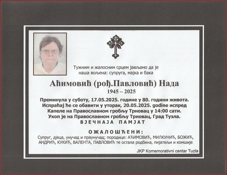 Sveta misa zadušnica slavit će se u ponedjeljak, 15. decembra/prosinca 2025. godine, u 12:00 sati, u crkvi sv. Petra i Pavla, nakon čega slijedi ukop na groblju Borić u Tuzli