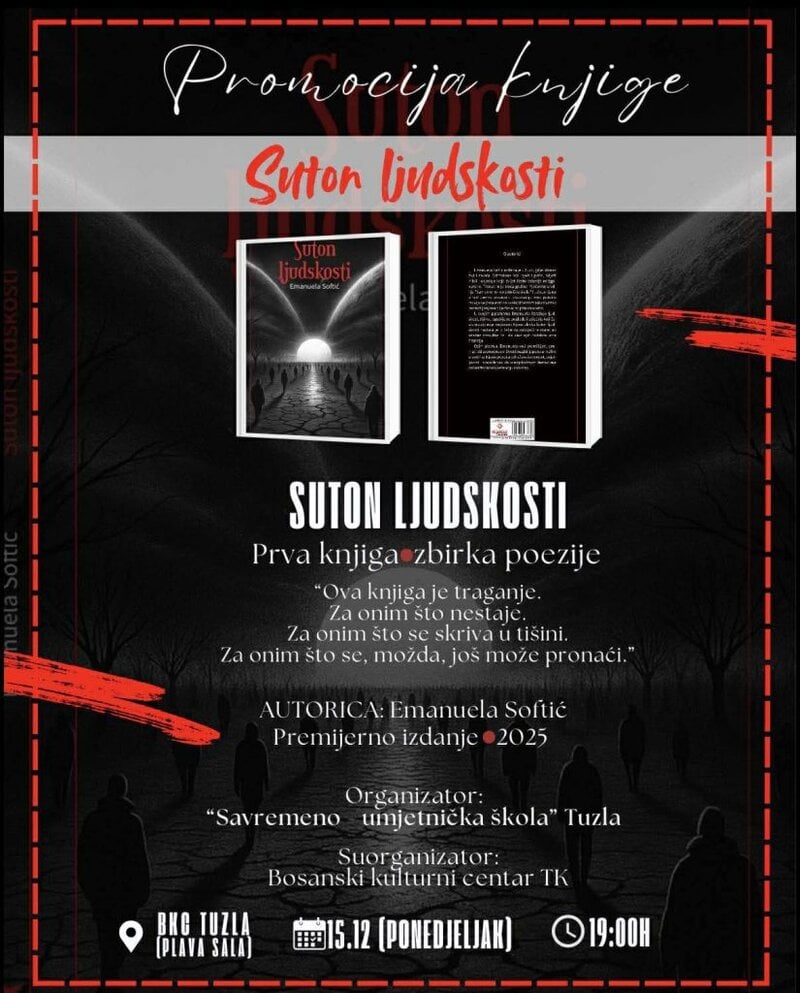 U okviru obilježavanja Dana “Savremene umjetničke škole” Tuzla, u ponedjeljak, 15. decembra, u Plavoj sali Bosanskog kulturnog centra TK, najavljena je promocija prve knjige mlade autorice, Emanuele Softić pod nazivom “Suton ljudskosti”.