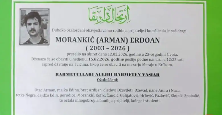 Dženaza za Erdoana Morankića, studenta koji je izgubio život u teškoj tramvajskoj nesreći u Sarajevu, obavit će se sutra u njegovom rodnom Brčkom. Dženaza će biti klanjana poslije podne namaza, ispred džamije na Ivicima, nakon čega će uslijediti ukop na mezarju Meraje.
