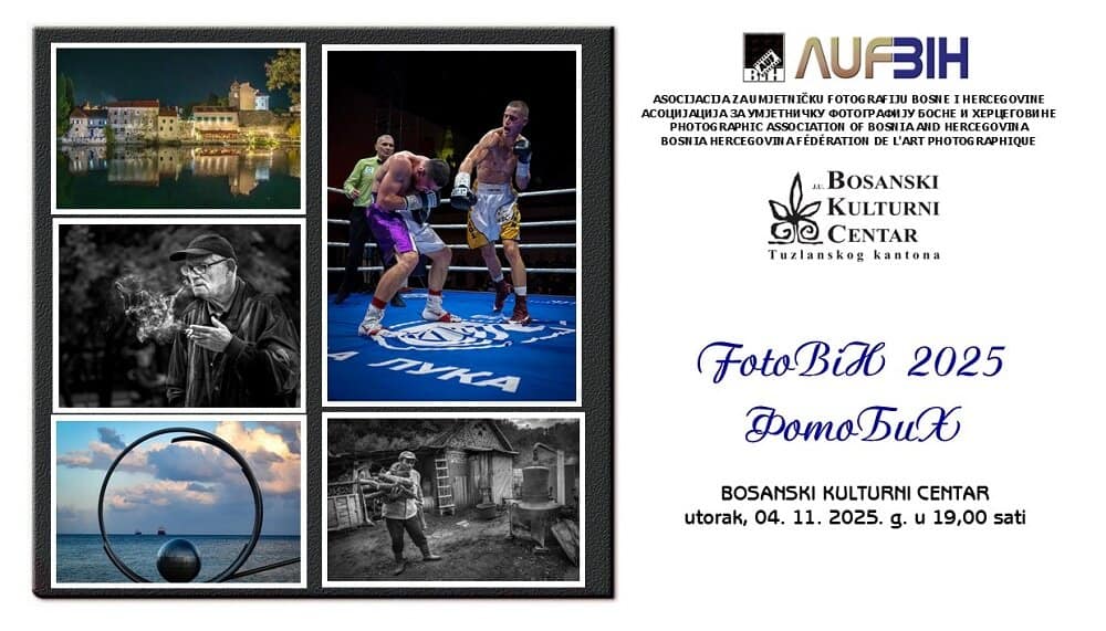 Bosanski kulturni centar Tuzla će biti domaćin Izložbe bosanskohercegovačke fotografije FotoBiH 2025, koja će svečano biti otvorena danas, u utorak, 4. novembra 2025. godine, u 19 sati. Ova tradicionalna manifestacija okuplja najbolje fotografe iz cijele Bosne i Hercegovine, predstavljajući najnovija ostvarenja u oblasti umjetničke fotografije.