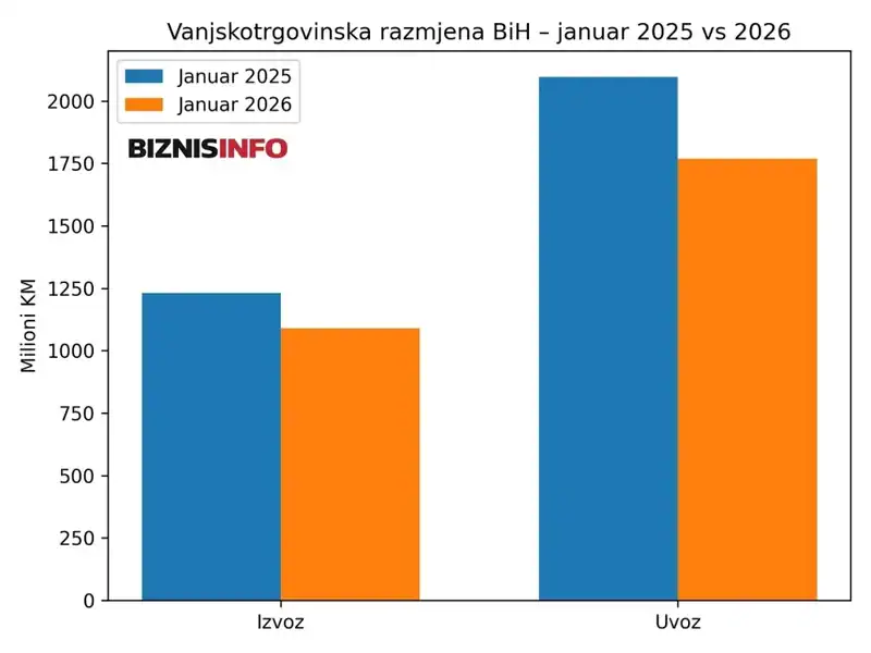 U januaru 2026. godine izvoz Bosne i Hercegovine iznosio je 1 milijardu i 89 miliona KM, što je za 11,5 posto manje u odnosu na januar 2025. godine.