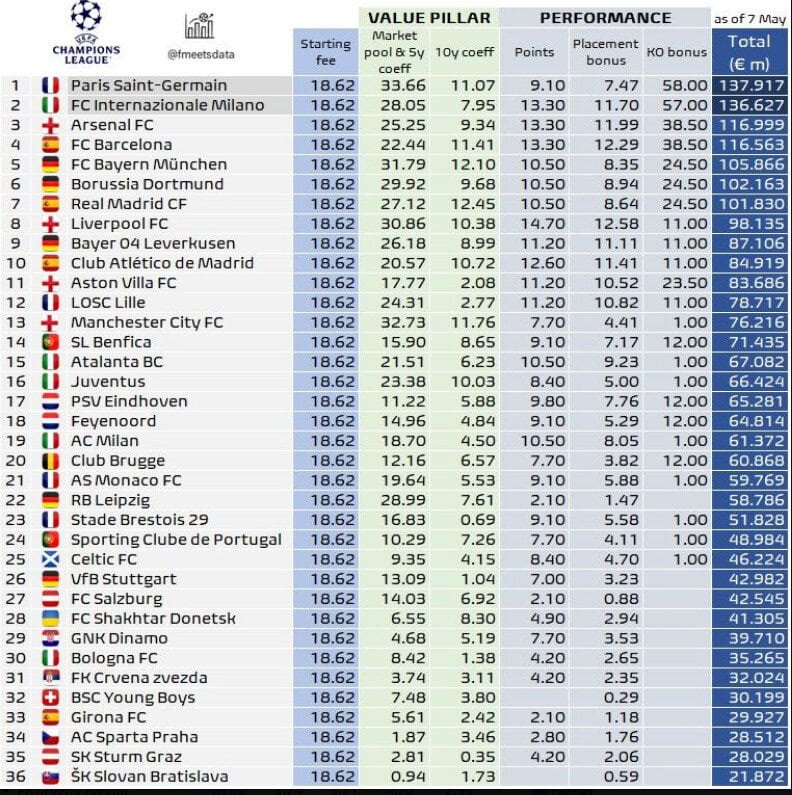 PSG je na vrhu sa 137,9 miliona, dok je odmah iza njih Inter sa 136,6 miliona. Pobjednik u finalu na račun dobije dodatnih 6,5 miliona eura kao i četiri miliona eura za učestvovavanje u evropskom Superkupu.