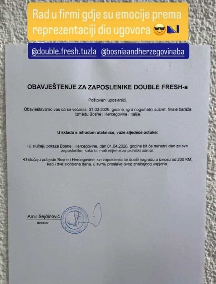 Naime, firma Double Fresh donijela je odluku da će ishod utakmice direktno uticati na radne obaveze i benefite radnika već narednog dana, 1. aprila 2026. godine.
