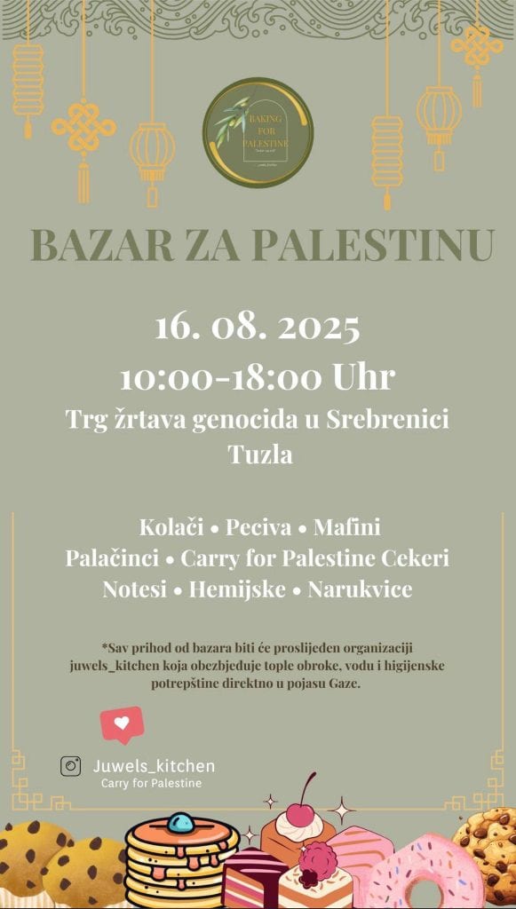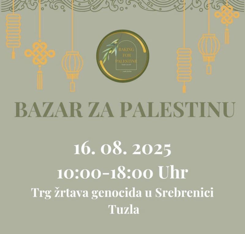 Tuzla će u subotu, 16. augusta 2025. godine, biti domaćin humanitarnog Bazara za Palestinu, koji će se održati na Trgu žrtava genocida u Srebrenici, u periodu od 10:00 do 18:00 sati.