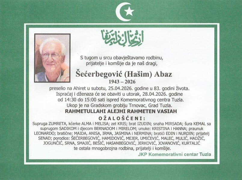 Ispraćaj i dženaza će se obaviti u utorak, 28. aprila 2026. godine ispred Komemorativnog centra u Tuzli, u vremenu od 14:30 do 15:00 sati. Ukop je na Gradskom groblju Trnovac u Tuzli. Laka mu bh. zemlja