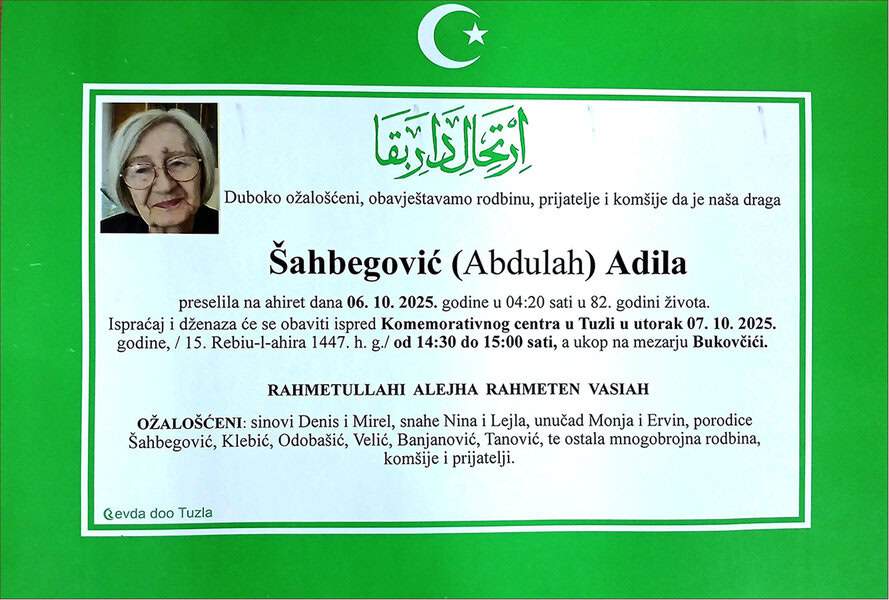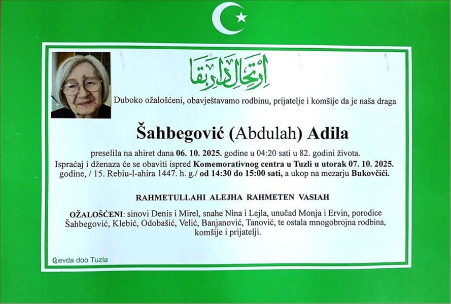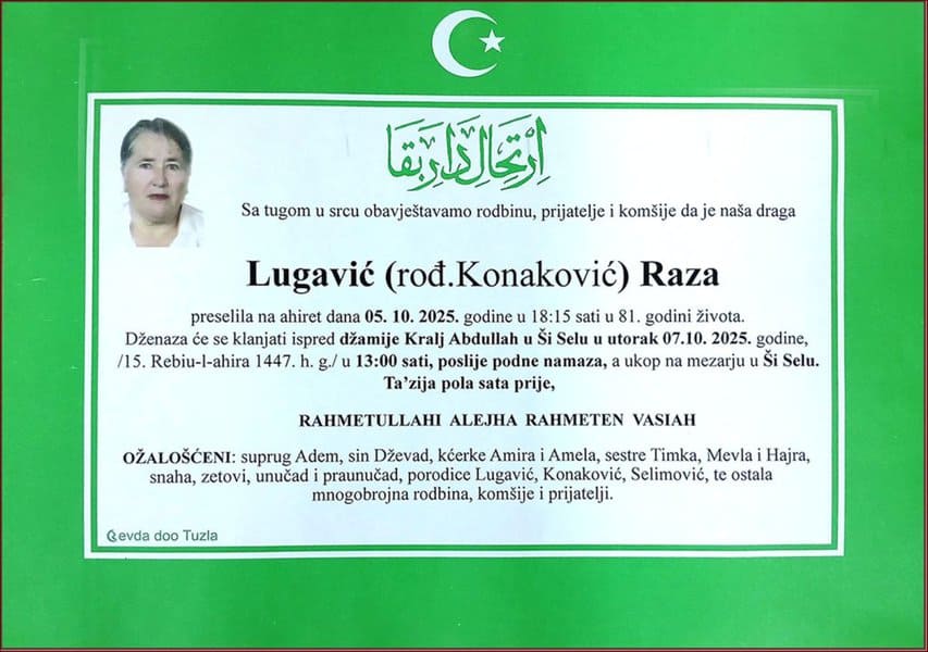 Preselile su na ahiret naše sugrađanke, prijateljice i komšinice, Adila ŠAHBEGOVIĆ i Raza LUGAVIĆ. Neka je vječni rahmet njihovim dušama. Laka im bh. zemlja...