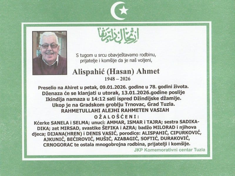In memoriam: Ahmet (Hasana) ALISPAHIĆDženaza će se klanjati u utorak, 13. januara 2026. godine ispred Džindijske džamije u 14:12 sati. Ukop je na Gradskom groblju Trnovac u Tuzli Desk10. 01. 2026.In memoriam, Info (Porodici i rodbini upućujemo saučešće – Tuzlalive.ba; Foto: Komemorativni centar Tuzla) Post Views: 223 Podijeli