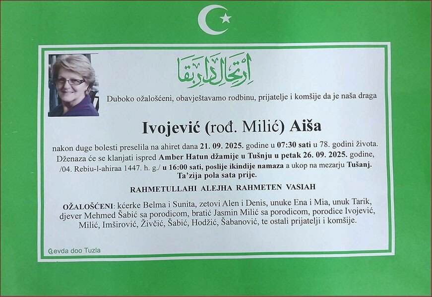 Dženaza će se klanjati ispred Amber Hatun džamije u Tušnju, u petak, 26. septembra 2025. godine u 16:00 sati. Ukop je na mezarju Tušanj