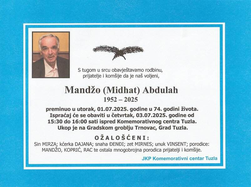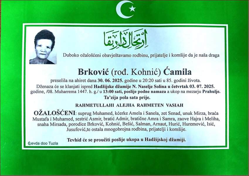 In memoriam: Aiša KOVAČEVIĆ, Abdulah MANDŽO, Ćamila BRKOVIĆ (Foto)Preminulo je više naših sumještana, prijatelja i komšija. Mir dušama njihovim. Laka im bh. zemlja... Desk02. 07. 2025.In memoriam, Info (Porodici, rodbini i prijateljima upućujemo iskreno saučešće – TuzlaL!VE.ba, Foto: PP Revda Tuzla) (Porodicama i rodbini upućujemo saučešće. Mir dušama njihovim – portal TuzlaLIVE.ba; Foto: PP Revda i Komemorativni centar Tuzla) Post Views: 344 Podijeli