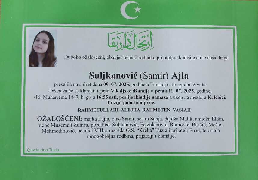 In memoriam: Ajla (Samira) SULJKANOVIĆPreminula je u 15. godini. Upućujemo joj posljednji pozdrav. Mir njenoj plemenitoj i nevinoj duši... Desk10. 07. 2025.In memoriam, Info (Neka te anđeli čuvaju, draga Ajla. Mir tvojoj duši, a laka bh. zemlja. Porodici saučešće i sabur – portal Tuzlive.ba; Foto: PP Revda Tuzla) Post Views: 300 Podijeli
