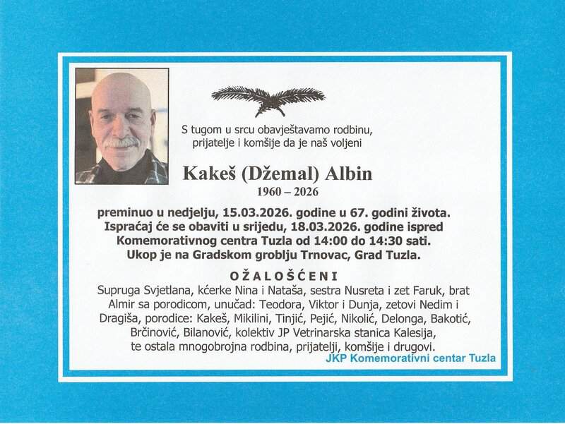 Prerano nas je napustio sugrađanin, prijatelj i komšija, Albin (Džemala) Kakeš. Upućujemo mu posljednji pozdrav. Mir duši njegovoj. Vječna mu slava i hvala. Laka mu bh. zemlja