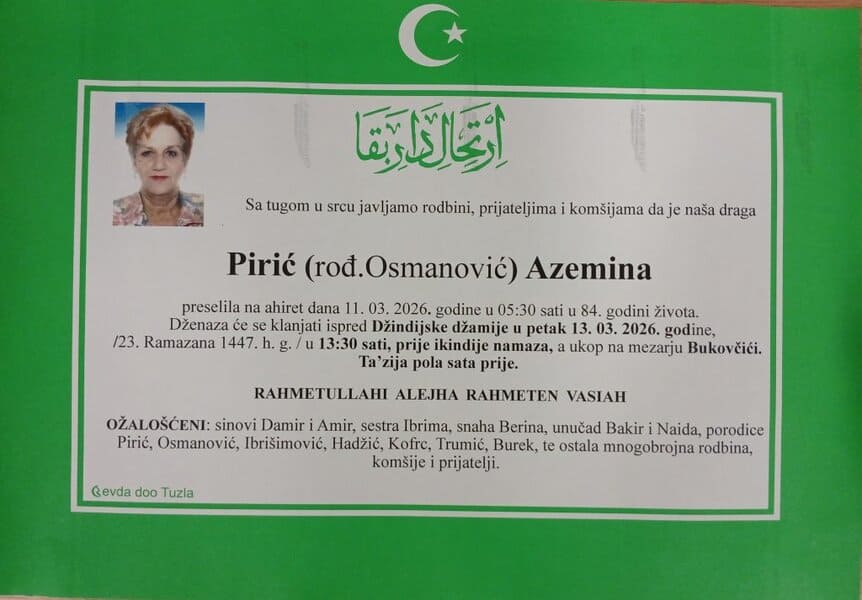 In memoriam: Alija FAZLIĆ (Muftić), Azemina PIRIĆ (Osmanović), Rabija SULJIĆ (Tanović)Neka je vječni rahmet njihovim plemenitim dušama. Porodicama saučešće i sabur. Laka im bh. zemlja Desk12. 03. 2026.In memoriam, Info (Porodicama i rodbini upućujemo saučešće. Mir dušama njihovim – TuzlaLIVE:ba; Foto: PP Revda Tuzla) Post Views: 325 Podijeli