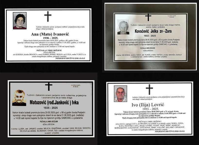 In memoriam: Ana IVANOVIĆ, Jelka KOVAČEVIĆ, Ivka MATUZOVIĆ, Ivo LOVRIĆPočivali u miru Božjem. Laka im bh. zemlja. Sućut obiteljima i rodbini... Desk30. 05. 2025.In memoriam, Info (Obiteljima, rodbini i prijateljima upućujemo iskrenu sućut – TuzlaL!VE.ba, Foto: PD ZOKA doo Tuzla i Juraj, Ljubače) Post Views: 406 Podijeli