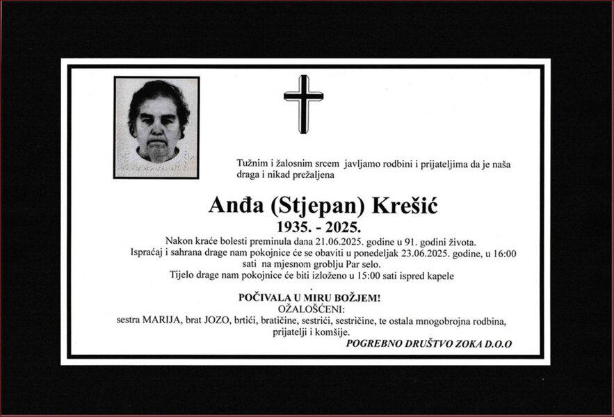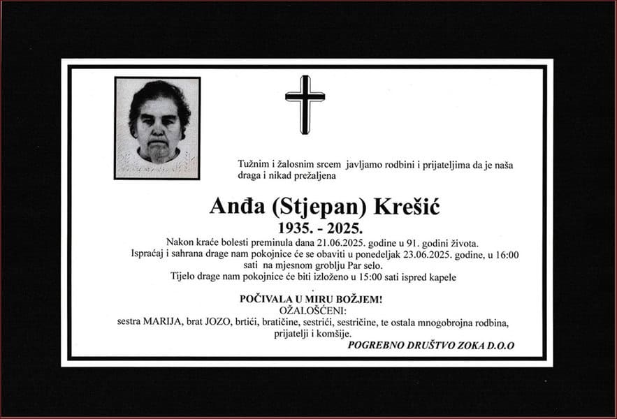 In memoriam: Anđa (Stjepana) KREŠIĆIspraćaj i sahrana obavit će se u ponedjeljak, 23. juna 2025. godine, u 16:00 sati... Desk22. 06. 2025.In memoriam, Info (Porodici, rodbini i prijateljima upućujemo iskreno saučešće – TuzlaL!VE.ba, Foto: PD ZOKA doo, Tuzla) Post Views: 274 Podijeli