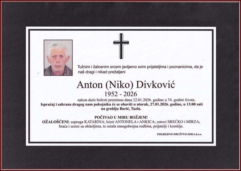 Ispraćaj i sahrana pokojnika obavit će se u utorak, 27. januara 2026. godine, u 13:00 sati, na groblju Borić u Tuzli. Počivao u miru Božjem. Laka mu bh. zemlja