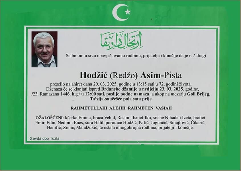 Dženaza će se klanjati ispred Brdžanske džamije u Tuzli, u nedjelju, 23. marta 2025. godine, u 12 sati...