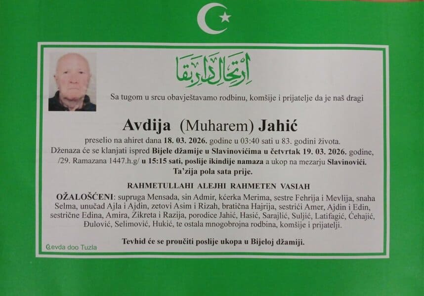 In memoriam: Avdija (Muharema) JAHIĆPorodici i rodbini saučešće i sabur. Mir duši njegovoj. Laka mu bh. zemlja Desk19. 03. 2026.In memoriam, Info (Porodici i rodbini saučešće i sabur. Mir duši njegovoj – Foto: PP Revda Tuzla) Post Views: 140 Podijeli