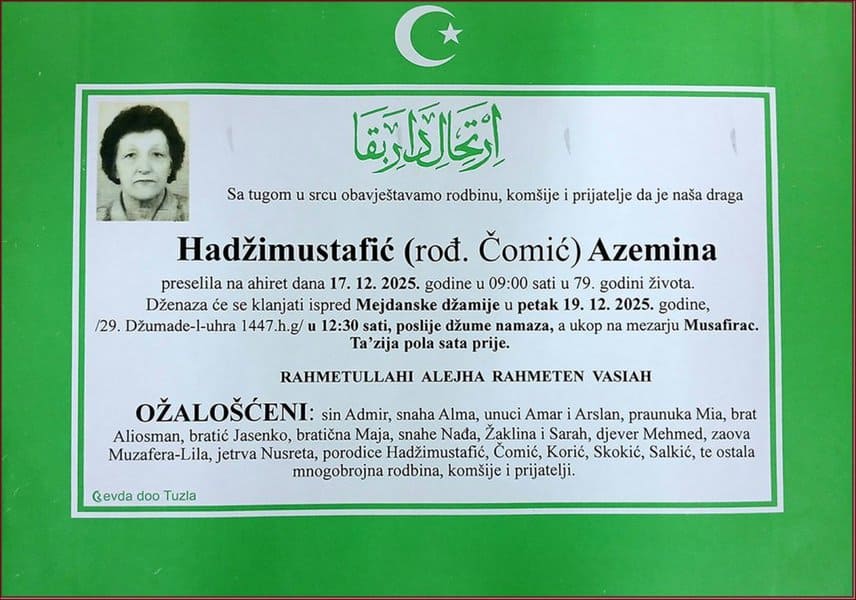 Dženaza će se klanjati ispred Mejdanske džamije u Tuzli, u petak, 9. decembra 2025. godine, u 12:30 sati. Ukop je na mezarju Musafirac