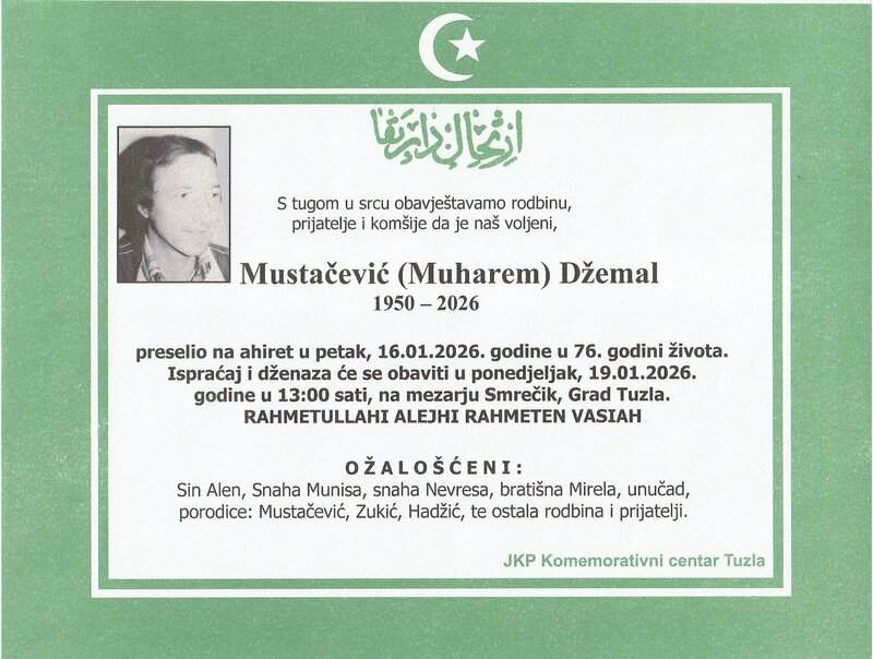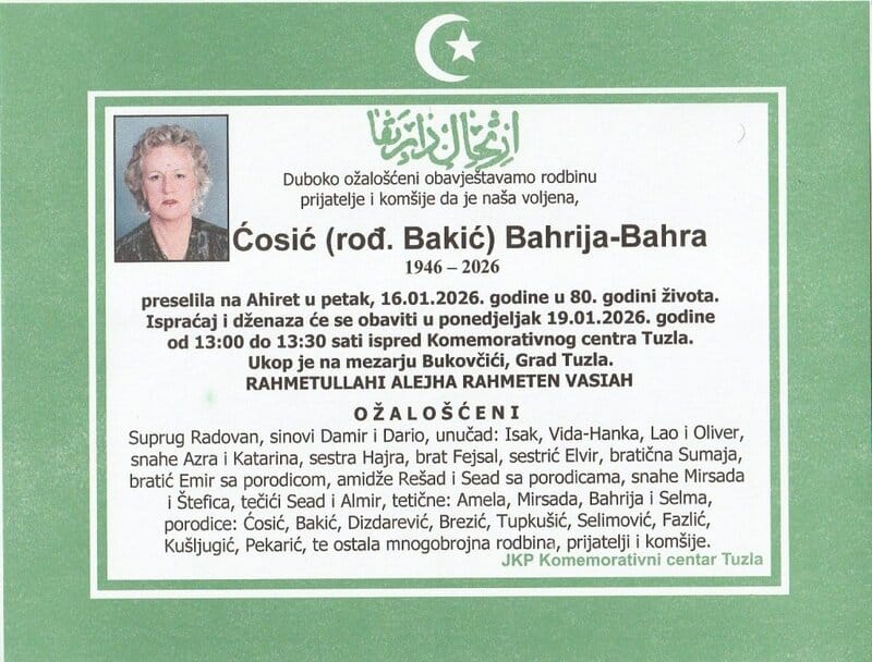 In memoriam: Bahrija-Bahra ĆOSIĆ (Bakić), Džemal (Muharema) MUSTAČEVIĆObje dzenaće obavit će se u ponedjeljak, 19. januara 2026. godine. Mir dušama njihovim. Laka im bh. zemlja Desk17. 01. 2026.In memoriam, Info (Porodicama i rodbini upućujemo iskreno saučešće – portal TuzlaLIVE.ba; Foto: Komemorativni centar Tuzla) Post Views: 283 Podijeli
