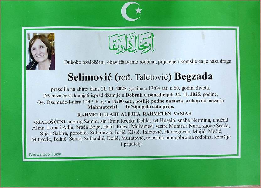 Prerano nas je, u 60. godini, napustila Begzada SELIMOVIĆ (Taletović). Neka je vječni rahmet njenoj duši. Porodici saučešće i sabur. Laka joj bh. zemlja