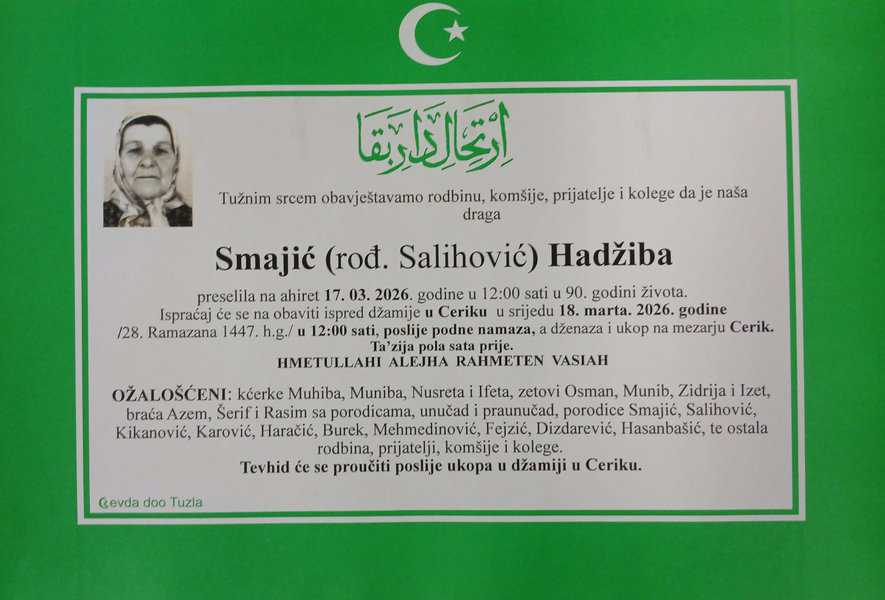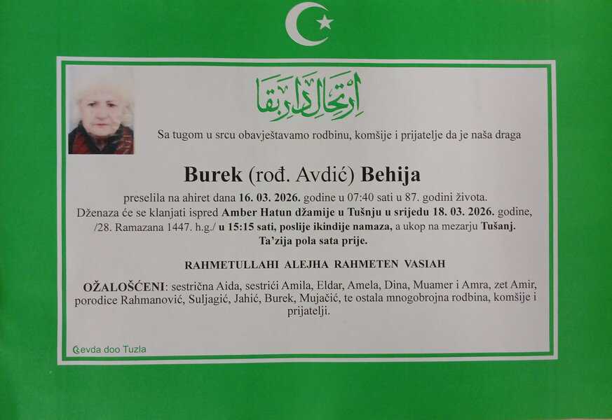 In memoriam: Behija BUREK (Avdić); Hadžiba SMAJIĆ (Salihović)Neka je vječni rahmet njihovim dušama, a laka bh. zemlja. Porodica,ma saučešće i sabur Desk18. 03. 2026.In memoriam, Info (Porodicama i rodbini upućujemo saučešće. Mir dušama njihovim – Tuzlalive.ba; Foto: PP Revda Tuzla) Post Views: 140 Podijeli