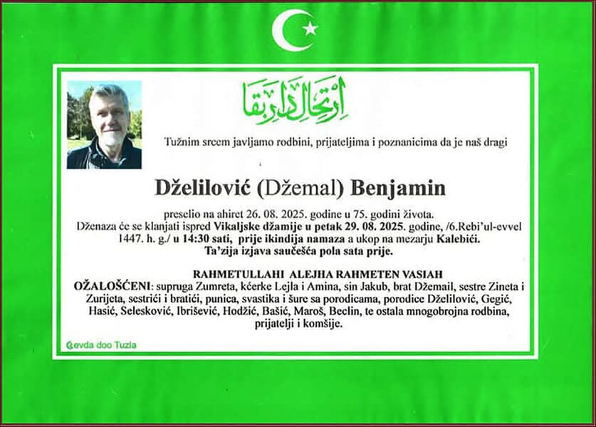 Dženaza će se klanjati ispred Vikaljske džamije u Tuzli, u petak, 29. augusta 2025. godine, u 14:30 sarti. Ukop je mezarju Kalebići