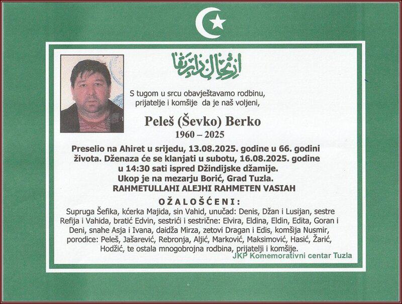 Prerano nas je napustio Berko (Ševke) PELEŠ. Dženaza će se klanjati u subotu, 16. augusta 2025. godine, u 14:30 sati, ispred Džindijske džamije u Tuzli. Ukop je na mezarju Borić