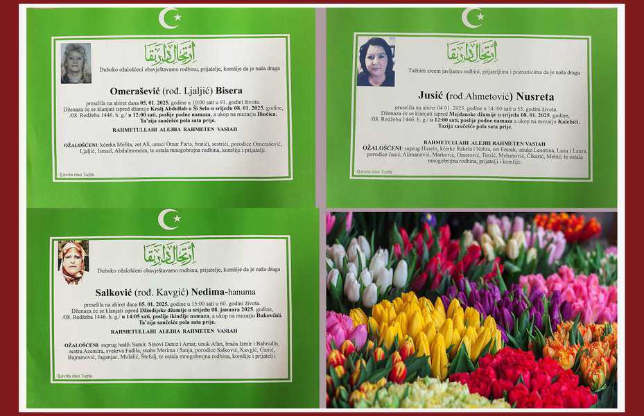 Preminulo je više naših sugrađanki i komšinica. Upućujemo im posljednji pozdrav. Neka je vječni rahmet dušama njihovim. Laka im bh zemlja...