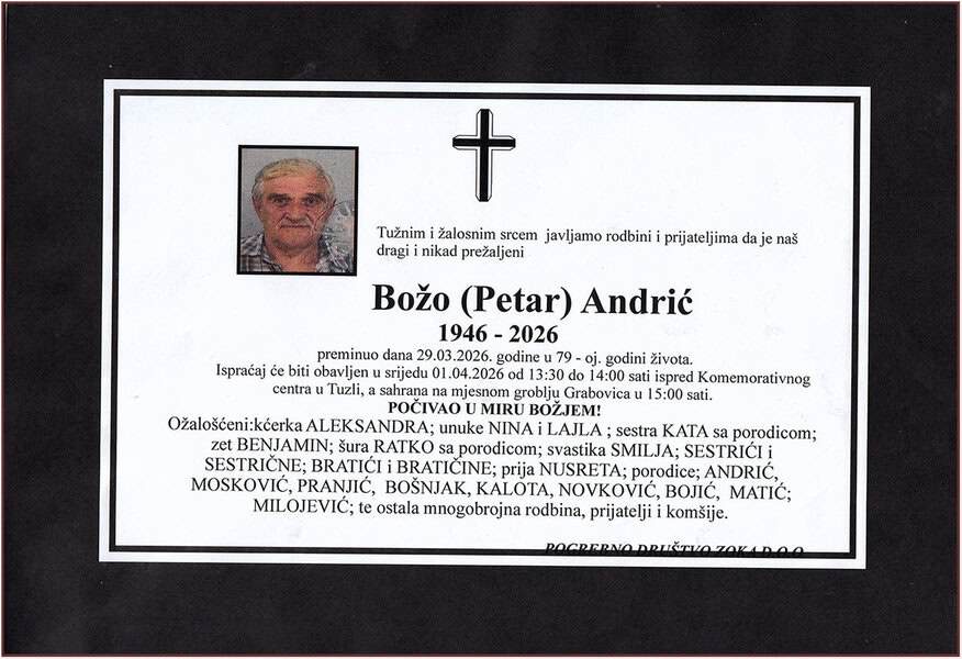 Ispraćaj će se obaviti u srijedu, 1. aprila 2026. godine, ispred Komemorativnog centra u Tuzli, u vremenu od 13:30 do 14:00 sati. Sahrana je na mjesnom groblju u Grabovici. Laka mu bh. zemlja