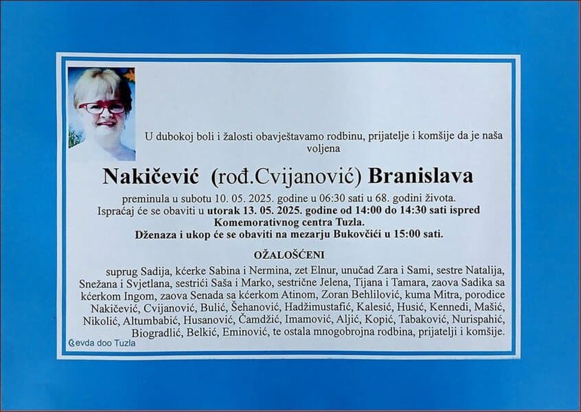 Preminula je naša sugrađanka, dobra osoba, prijateljica i komšinica, Branislava Nakičević (Cvijanović). Mir duši njenoj plemenitoj. Laka joj bh. zemlja...
