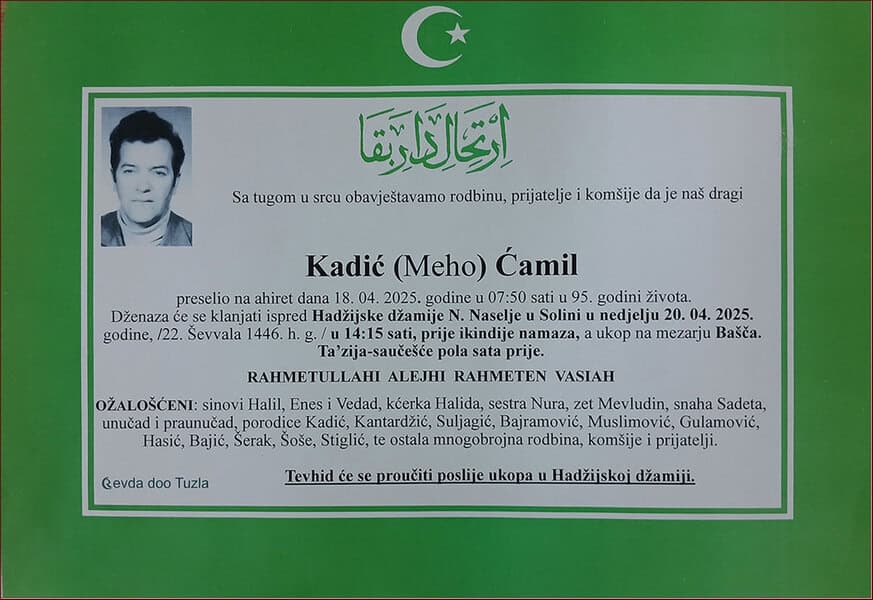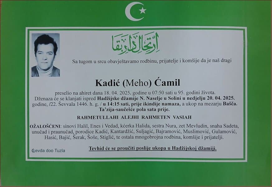 Dženaza će se klanjati ispred Hadžijske džamije u Novom Naselju - Solina, u nedjelju, 20. aprila 2025. godine...
