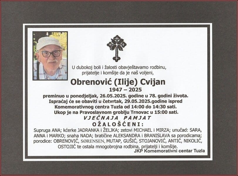Ispraćaj će se obaviti u četvrtak, 29. maja 2025. godine, ispred Komemorativnog centra u Tuzli od 14:00 do 14:30 sati. Počivao u miru Božjem...