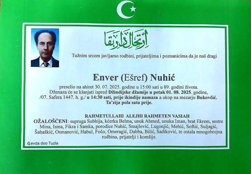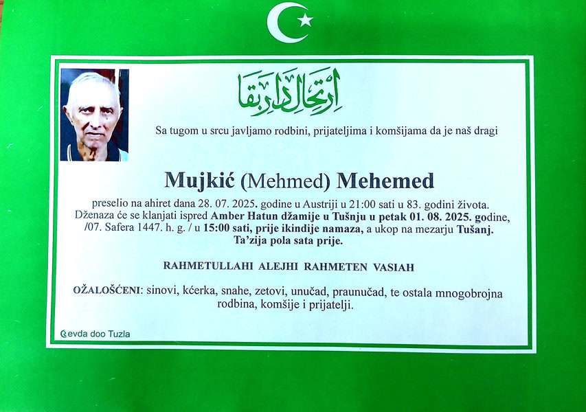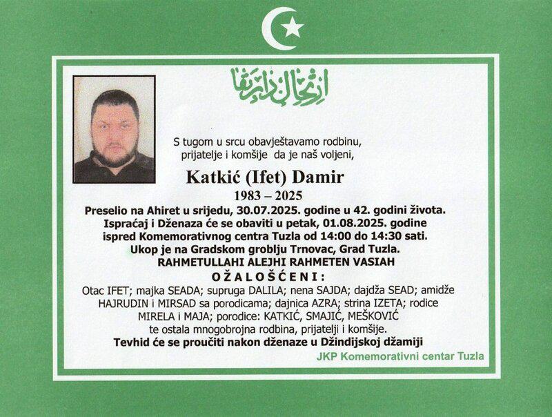 In memoriam: Damir (Ifeta) KATKIĆ, Mehemed (Mehmeda) MUJKIĆ, Enver (Ešrefa) NUHIĆ (Foto)Preminulo je više naših sugrađana, prijatelja i komšija. Damir je preselio vrlo mlad. Mir dušama njihovim. Laka im bh. zemlja Desk31. 07. 2025.In memoriam, Info, Izdvajamo (Porodicama i rodbini upućujemo iskreno saučešće – portal TuzlaLIVE.ba; Foto: Komemorativni centar i PD Revda Tuzla) Post Views: 349 Podijeli