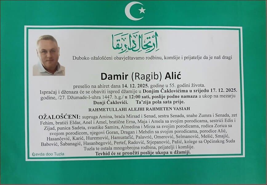 Prerano je, u 55. godini, preselio na ahiret Damir (Ragiba) ALIĆ. Upućujemo mu posljednji pozdrav. Mir duši njegovoj. Laka mu bh. zemlja