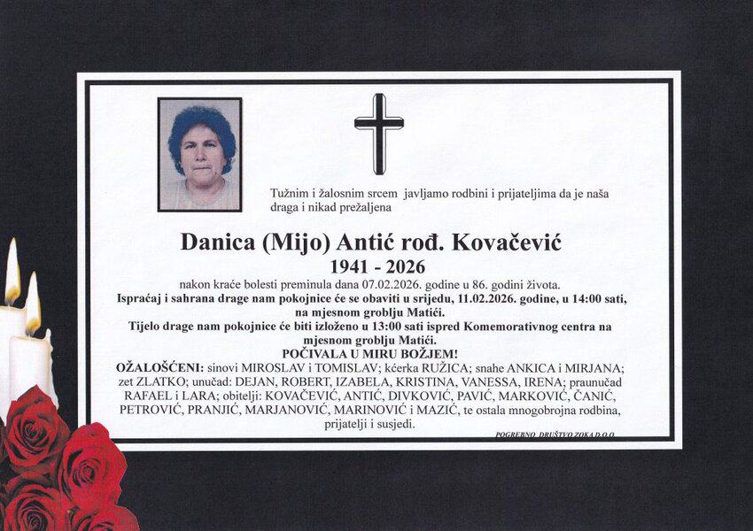 Ispraćaj i sahrana pokojnice obavit će se u srijedu, 11. februara 2026. godine, u 14:00 sati, na mjesnom groblju Matići.