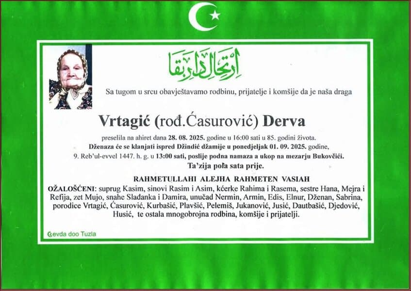 Preselila na ahiret u 85. godini. Dženaza će se klanjati u ponedjeljak, 1. septembra 2025. godine, u 13 sati, ispred Džindijske džamije u Tuzli