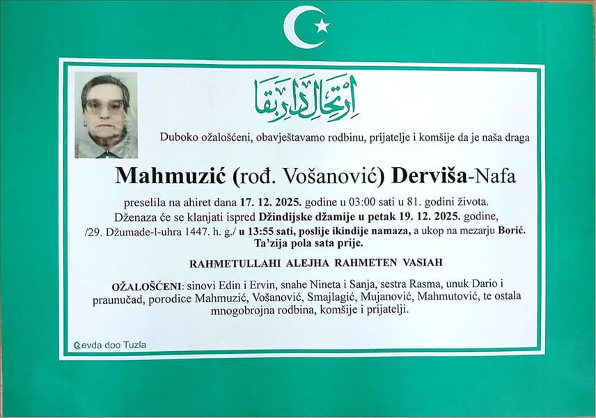 Dženaza će se klanjati ispred Džindijske džamije u Tuzli, u petak, 19. decembra 2025. godine, u 13:55 sati. Ukop je na mezarju Borić Tuzla