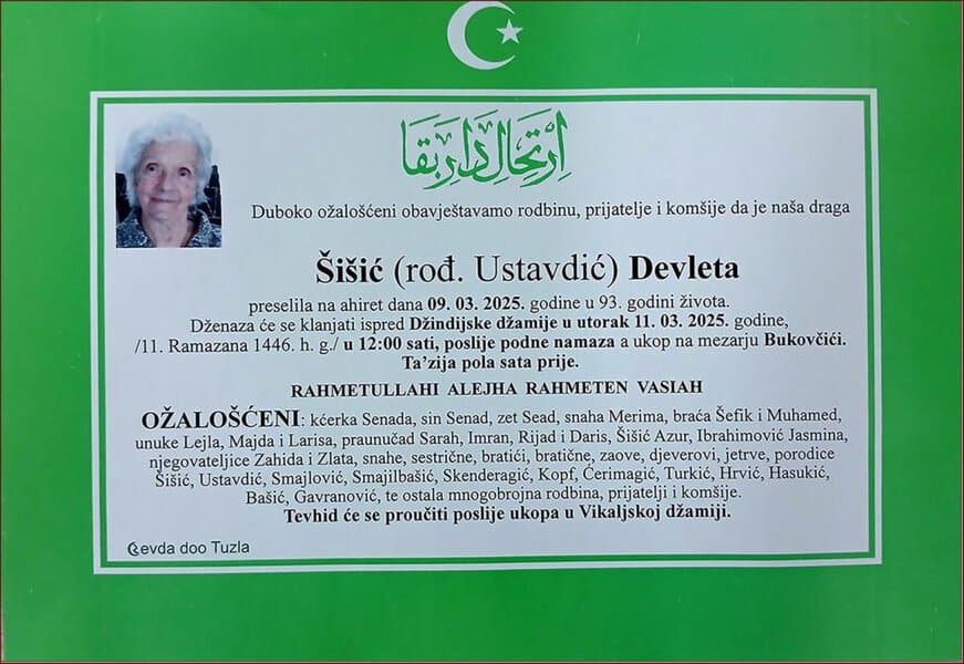 In memoriam: Devleta ŠIŠIĆ (Ustavdić)Dženaza će se klanjati ispred Džindijske džamije u Tuzli, u utorak, 11. marta 2025. godine u 12 sati... Desk10. 03. 2025.In memoriam, Info (Porodici, rodbini i prijateljima upućujemo iskreno saučešće – TuzlaL!VE.ba, Foto: PP Revda Tuzla) Post Views: 304 Podijeli