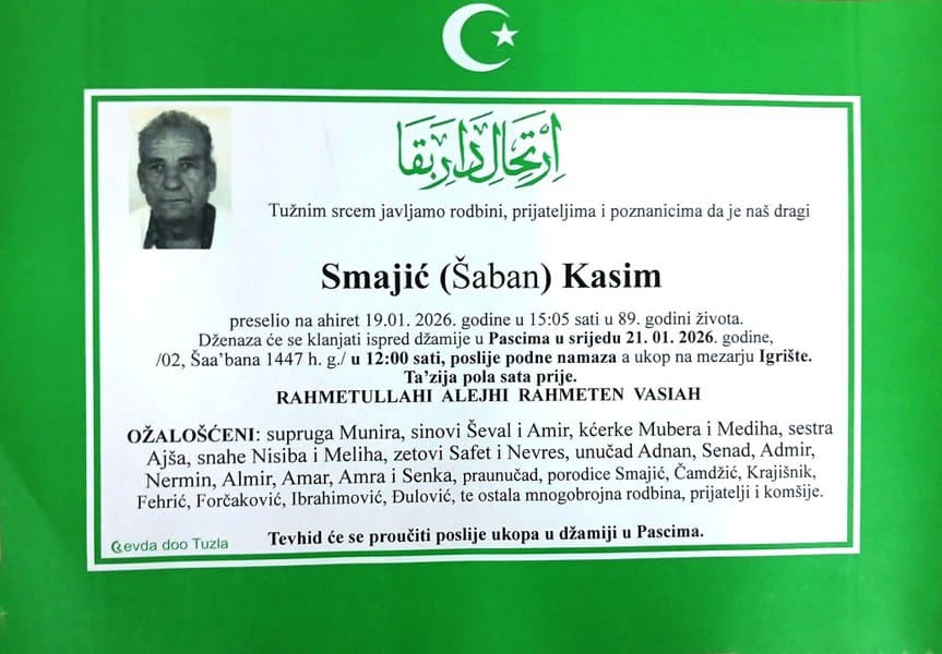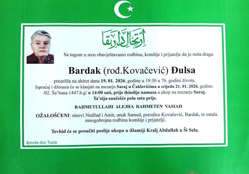 In memoriam: Đulsa BARDAK (Kovačević), Kasim (Šabana) SMAJIĆPorodicama i rodbini upućujemo iskreno saučešće. Mir dušama njihovim. Laka im bh. zemlja... Desk20. 01. 2026.In memoriam, Info (Porodicama i rodbini upućujemo iskreno saučešće. Mir dušama njihovim – Tuzlalive.ba; Foto: PP Revda Tuzla) Post Views: 228 Podijeli