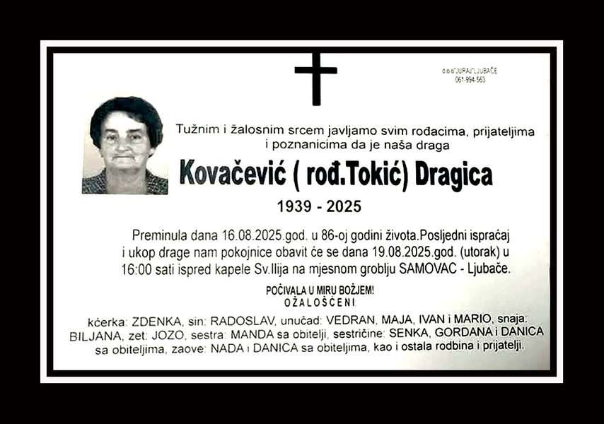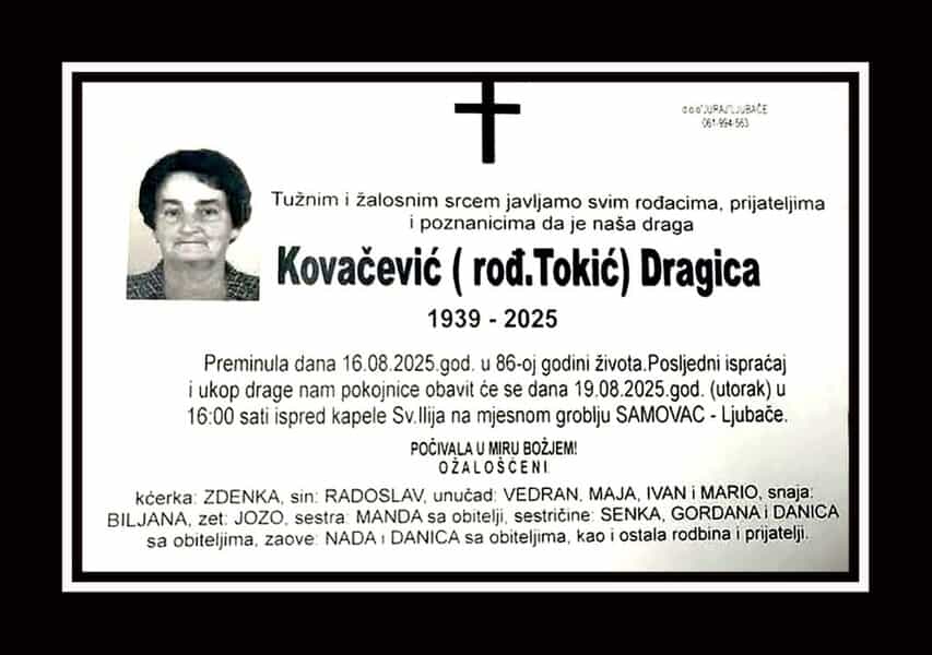 In memoriam: Dragica KOVAČEVIĆ (Tokić)Posljednji ispraćaj i ukop pokojnice obavit će se u utorak, 19. augusta 2025. godine u 16:00 sati... Desk18. 08. 2025.In memoriam, Info (Obitelji i rodbini upućujemo iskrenu sućut. Počivala u Miru Božjem – TuzlaLIVE.ba; PD Juraj, Ljubače) Post Views: 258 Podijeli