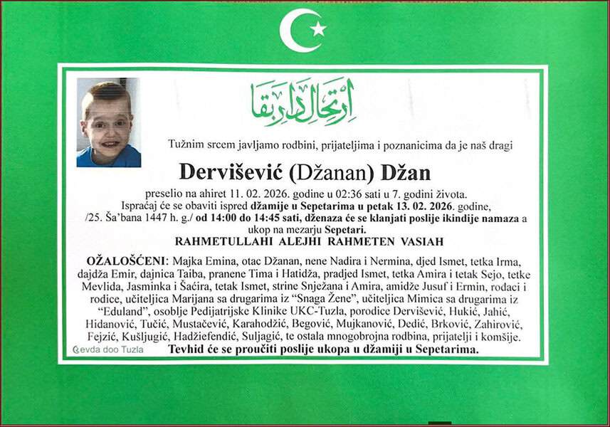 Tuga do neba. Preselio je na ahiret u 7. godini Džan (Džanana) DERVIŠEVIĆ. Iskreno saučešće i sabur rodbini. Mir dušici njegovoj.