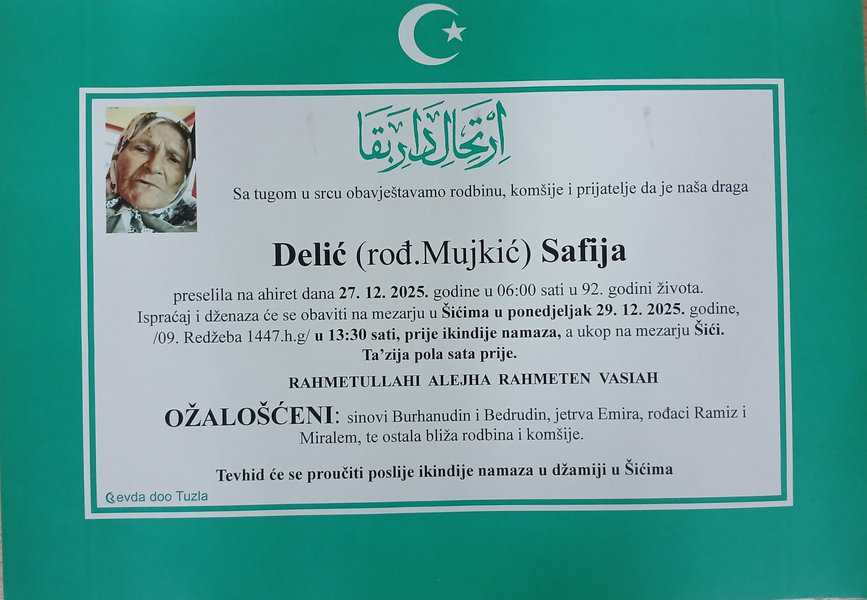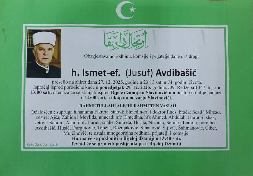 In memoriam: Ef. Ismet (Jusufa) AVDIBAŠIĆ; Safija DELIĆ (Mujkić)Neka je vječni rahmet njihovim plemenitim dušama. Porodicama saučešće i sabur. Laka im bh. zemlja Desk28. 12. 2025.In memoriam, Info (Porodicama i rodbini upućujemo iskreno saučešće. Mir dušama njihovim – Tuzlalive.ba; Foto: PP Revda Tuzla Post Views: 303 Podijeli
