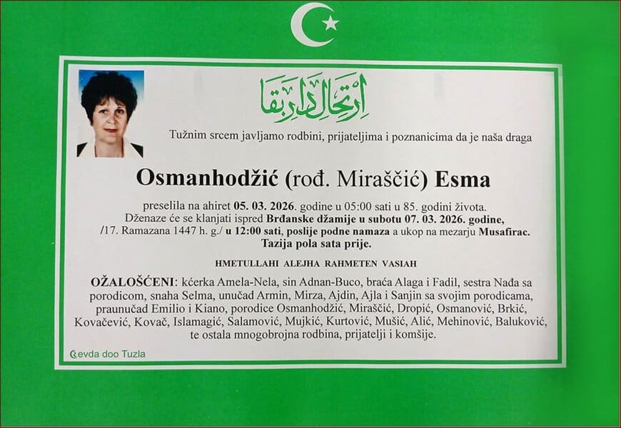 Dženaza će se klanjati ispred Brdžanske džamije u subotu, 7. marta 2026. godine, u 12.00 sati, Ukop j na mezarju Musafirac.