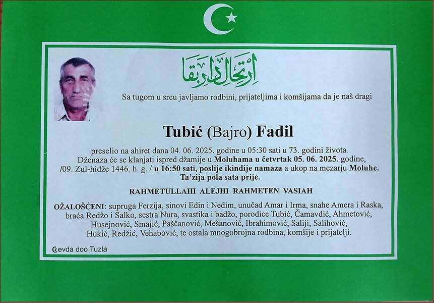 In memoriam: Fadil (Bajre) TUBIĆDženaza će se klanjati ispred džamije u Moluhama, u četvrtak, 5. juna 2025. godine, u 16:50 sati... Desk04. 06. 2025.In memoriam, Info (Porodici, rodbini i prijateljima upućujemo iskreno saučešće – TuzlaL!VE.ba, Foto: PP Revda Tuzla) Post Views: 310 Podijeli