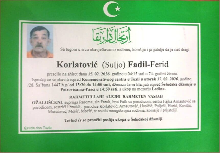 Ispraćaj će se obaviti ispred Komemorativnog centra u Tuzli, u utorak, 17. februara 2026. godine, od 13:30 do 14:00 sati. Ukop je na mezarju Ledina.
