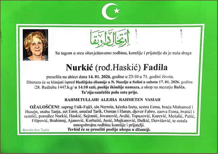 Dženaza će se klanjati ispred Hadžijske džamije u Novom Naselju u Solini, u subotu, 17. januara 2026. godine u 14:10 sati. Ukop je na mezarju Bašča. Mir duši njenoj. Laka joj bh. zemlja