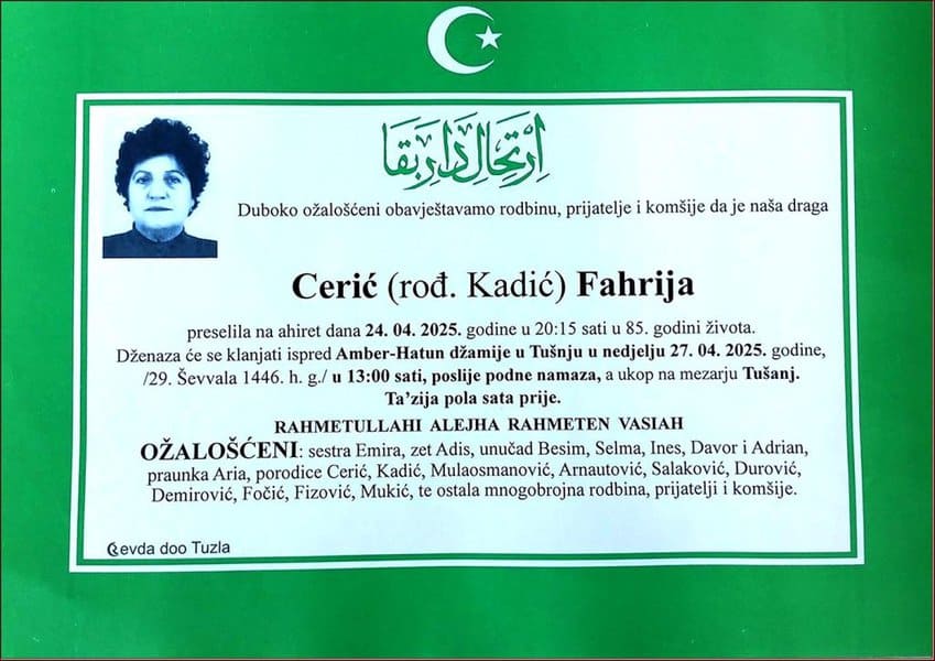 Dženaza će se klanjati ispred Amber-Hatun džamije u Tušnju, u nedjelju, 27. aprila 2025. godine u 13:00 sati. Laka joj bh. zemlja...